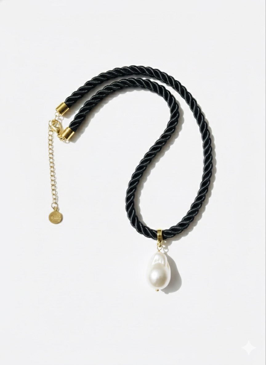 A study in contrast and simplicity. A lustrous white baroque freshwater pearl hangs from a black twisted cord, accented with gold-plated hardware, and adjustable clasp. Refined enough for evening, effortless for day.